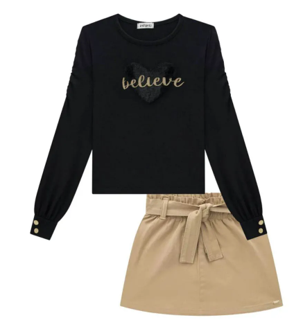 Marca Infanti Indicado para Dia a Dia Coleção Outono Iverno Não secar na secadora; Lavar com cores similares, separar as roupas claras das escuras, e também por tipo de tecido; Para saber exatamente como lavar e secar as suas peças, siga as instruções de lavagem obtidas na etiqueta interna de cada produto. Composição: Ref: 71463: BLUSA : 97% ALGODÃO, 3% ELASTANO ; Ref: 71464: SAIA : 97% ALGODÃO, 3% ELASTANO