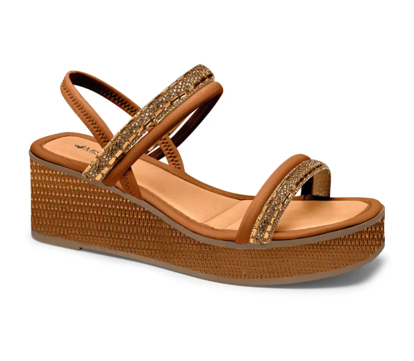 O destaque desta sandália fica por conta do salto anabela de 6 cm com revestimento tramado, trazendo um mood artesanal ao modelo. Além disso, as duas tiras que envolvem o pé, com detalhe em volume discreto, conferem um toque de sofisticação e feminilidade. Já o material sintético garante durabilidade, tornando-a ideal para o uso diário.