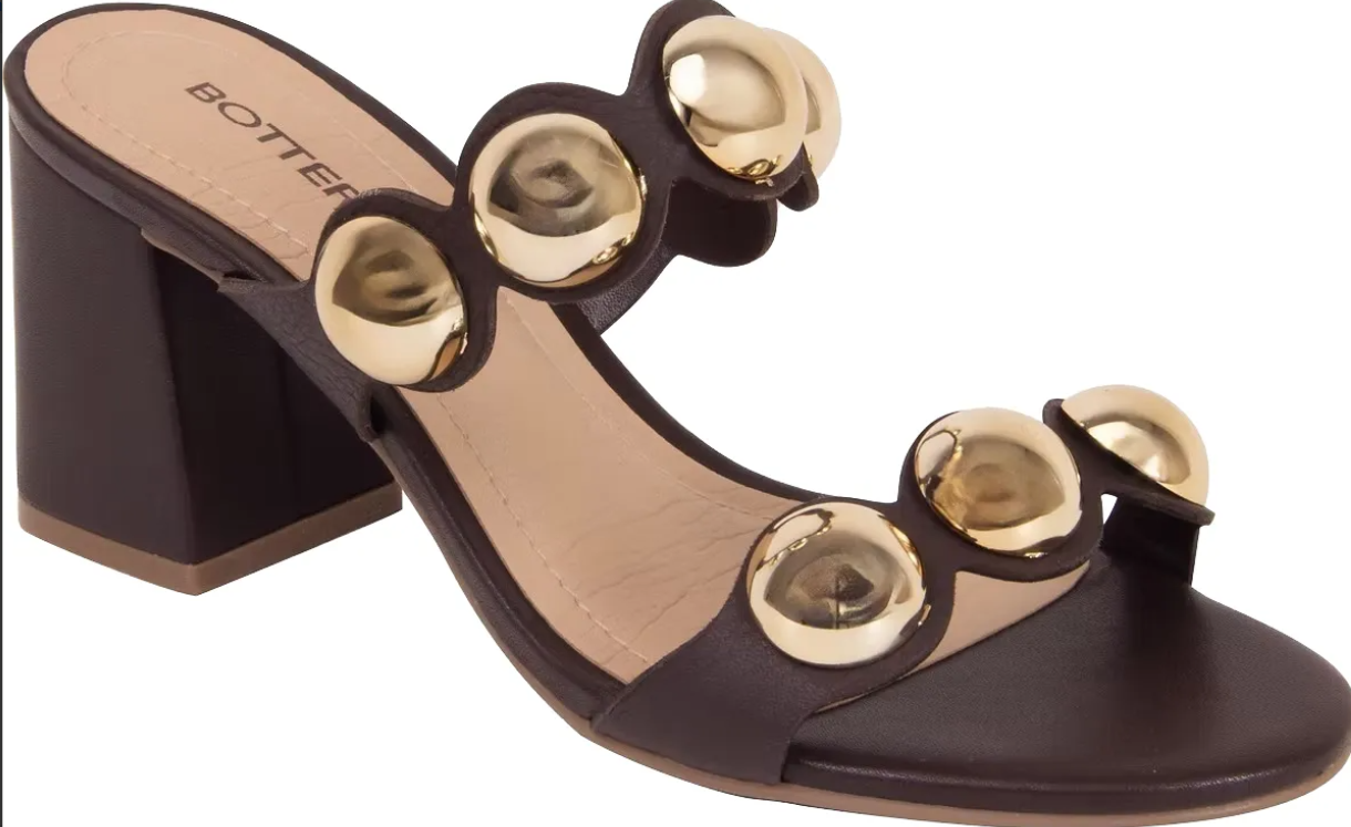 Tamanco em couro burnish . De salto bloco alto. Possui gáspea aberta com enfeite de metal dourado. Tamanho do salto: 8cm